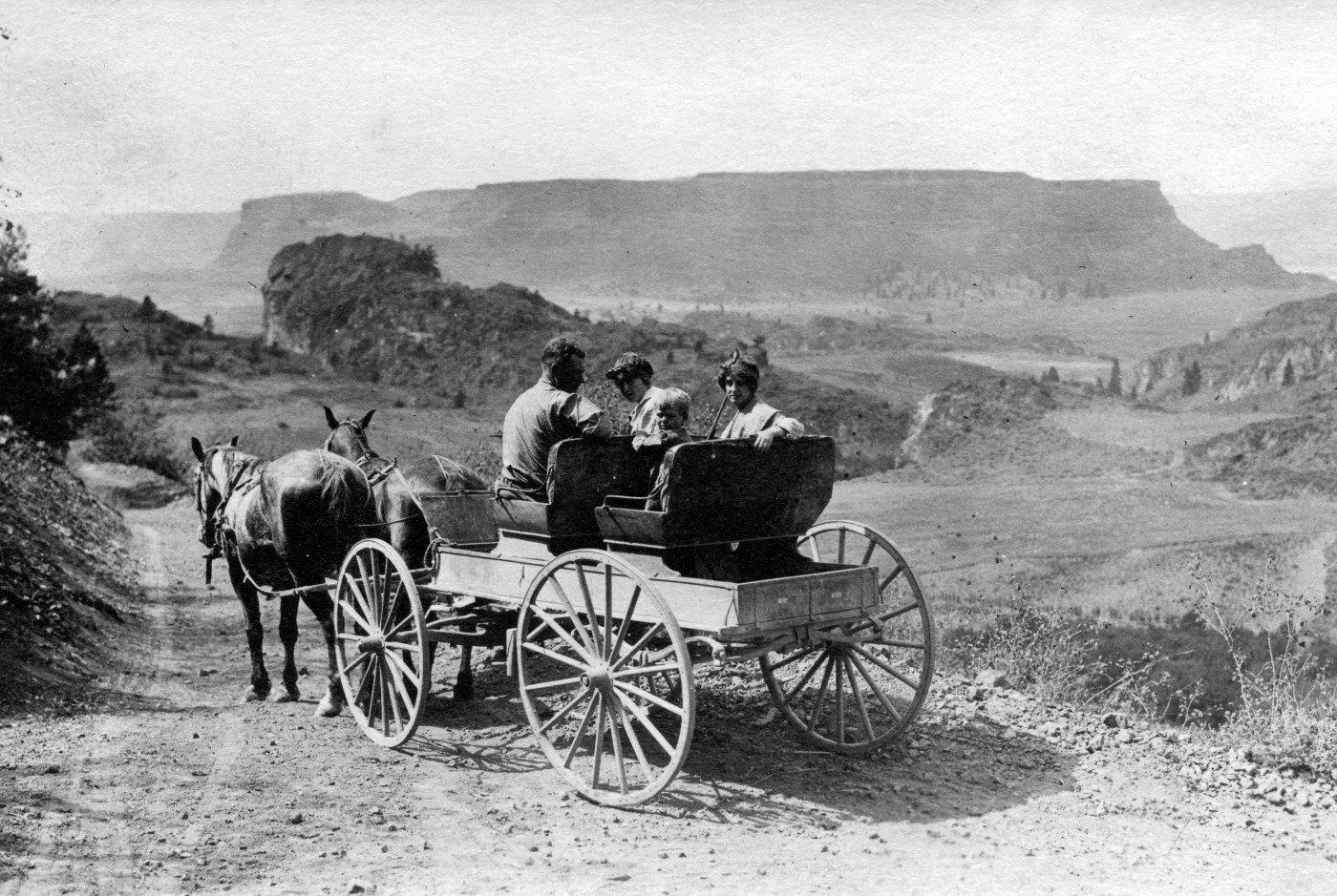 George and Caty Northrup weren’t the only family in the canyon at the turn of the 20th century. Scheibner brothers Charles and Fred had moved into the canyon a couple years earlier and were already known for their produce, in particular, luscious strawberries. In 1901 with the backing of the farming community around Steamboat Rock the brothers petitioned the county for a bond to create a road up the south talus slope wall. The main purpose for the new road was to move fresh produce up to the railhead in Almira or Hartline quicker. The bond was granted by Douglas County and by July 1902 the newly christened County Route 337 was opened to the public. Horse drawn wagons of fruit and people made their way up the County Route, and back down into the canyon. County Route 337 suffered problems from the start. Frequent rockslides meant continuous maintenance, and there were several incidents with wagons on the switchbacks near the top. By 1920 the age of automobiles and lack of upkeep made Route 337 obsolete to all but a few thrill-seekers. Eventually it became known as the Scheibner Grade in Northrup Canyon. (top image courtesy Coulee Pioneer Museum, c.early 1900s)